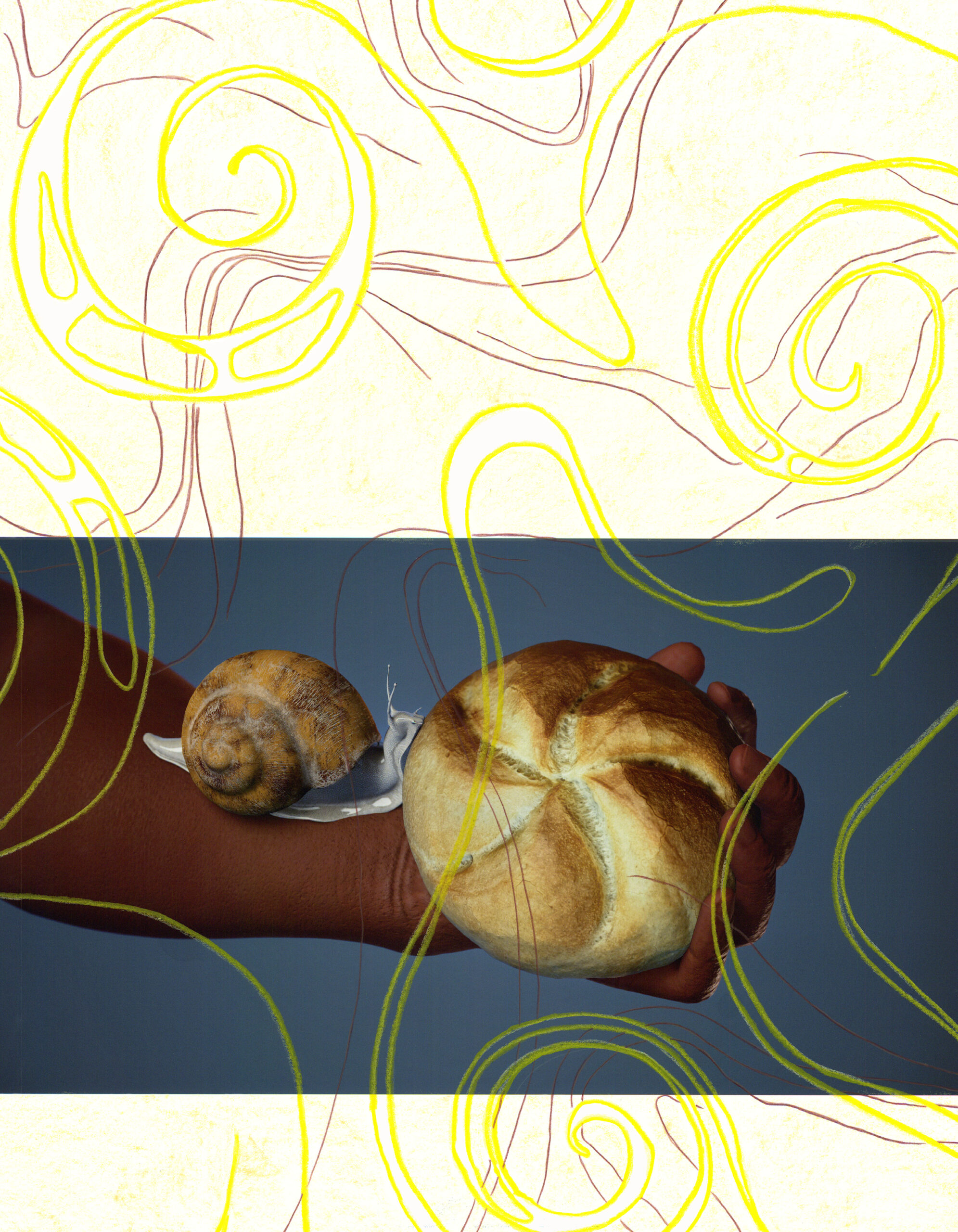 Rhona Mühlebachs Begegnung einer Weinbergschnecke und einer Semmel auf einem Unterarm ist so schön wie die berühmte Begegnung einer Nähmaschine und eines Regenschirms auf dem Seziertisch. Diese literarische Verortung des Surrealismus, 1868 notiert in den Gesängen des Maldoror durch den französischen Dichter Comte de Lautréamont, alias Isidore Lucien Ducasse, mäandert wahlverwandt durch das Kunstblatt «Schnecke und Semmel im Sturm». Weit- läufig und vielschichtig sind sie beide.